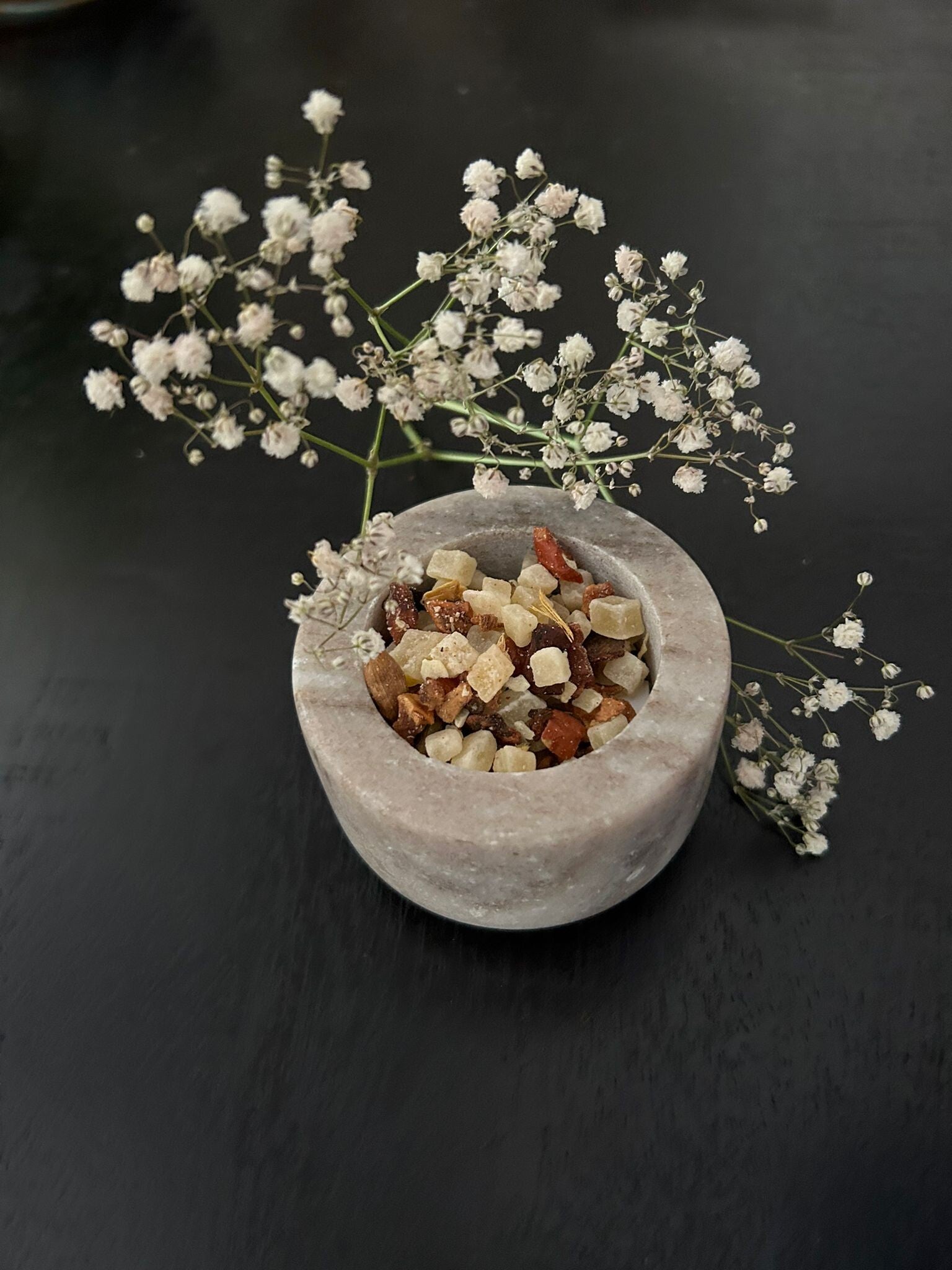 Mango stukjes (mango, suiker, citroenzuur (acidifier)) (55%), appel stukjes, kokos chips, steranijs, kaneel, kardemom vruchten, gember, zoethout, kruidnagel, roze peper, aroma.