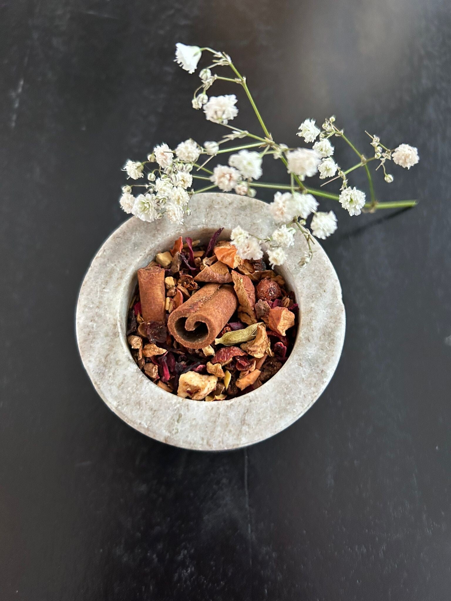 Appel stukjes , druiven , hibiscus , kaneel , rozenbottel schillen , gember , zoethout , aroma , geschaafde amandelen , citrus plakjes , kardemom vruchten , aardbei plakjes , knoflook, rode bessen , rozenblaadjes , pioenbloemblaadjes.